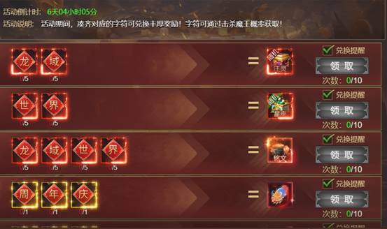 活动内容:活动条件:周年狂欢时段,野外魔王掉落大量字体!收集道具“龙”“域”“世”“界”“周”“年”“庆”,集齐不同组合的字样,可以兑换海量奖励,更有专属周年纪念限定称号。